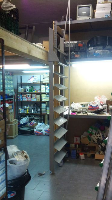 Escalera móvil para altillo realizada en acero al carbono con barandilla abatible por problemas de espacio.